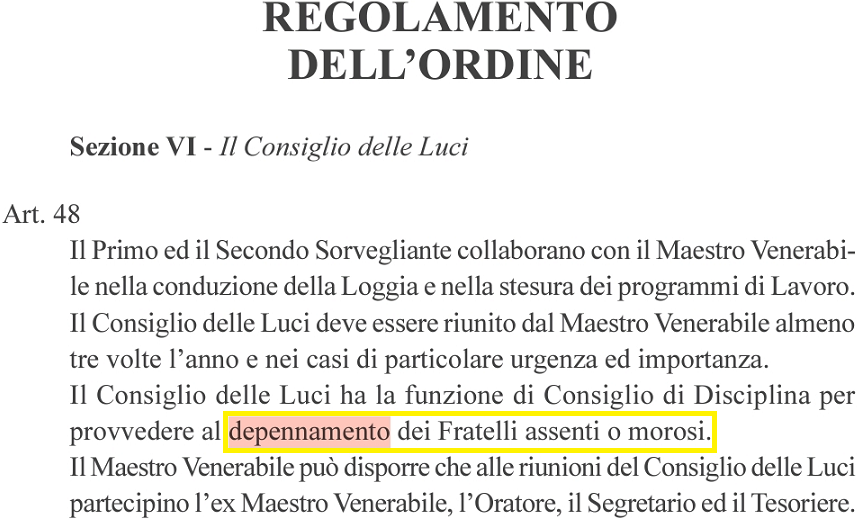 Il problema nasce proprio in questo: ammettere la colpa massonica per reati connessi a ‘ndrangheta, mafia e camorra farebbe crollare la tesi negazionista per la quale si è spesa fino al midollo l’attuale Gran Maestranza del G.O.I., che anche di fronte ai casi più eclatanti ha scelto deliberatamente di fermarsi agli atti di decretazione, senza mai trovare il coraggio per intraprendere le vie giuridiche interne in grado di condurre ad una reale espulsione dei “fratelli” coinvolti in fatti di malaffare. Nemmeno a seguito di condanna definitiva! Preferendo invece ricorrere a veri e propri sotterfugi giuridici, attraverso – ad esempio – l’emanazione di Decreti Magistrali di depennamento degli affiliati coinvolti, che però risultano impossibili a termini regolamentari, dato che il “depennamento” configura una sanzione esclusivamente amministrativa che non solo non è nella disponibilità del Gran Maestro, bensì del Consiglio di Disciplina delle singole Logge, ma è pure destinata ai soli casi di morosità o assenza dai Lavori rituali.